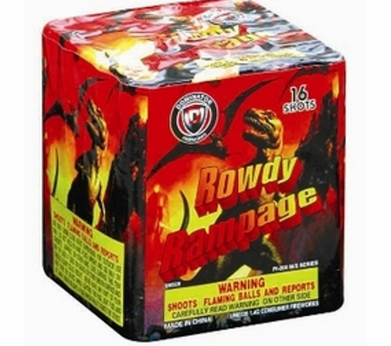 Rowdy Rampage, a compact yet powerful 200-gram cake by Dominator Fireworks, measuring approximately 4″W x 4″L x 4″H. This little dynamo packs 16 shots of chrysanthemums to crackle and color. With a duration of about 24 seconds, Rowdy Rampage is a perfect addition to any celebration, small or large.